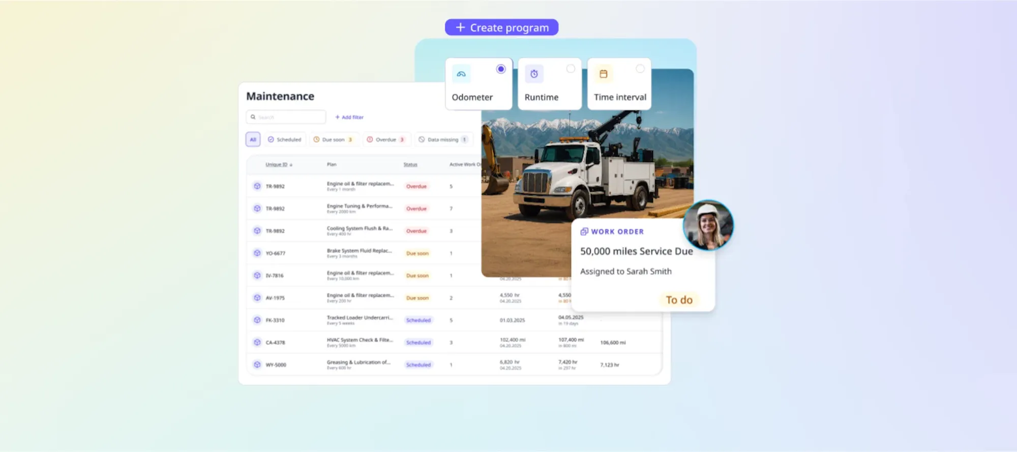 - Create maintenance programs: Stay on top of maintenance with a control room that tells you when assets are scheduled or overdue for servicing. Create tailored maintenance programs for each asset type, complete with history logs to stay organized and proactive. Set triggers based on odometer readings, runtime hours or time intervals to automatically alert your team when service is due. Manage work orders from start to finish to ensure nothing gets missed—so assets are always ready when they’re needed.